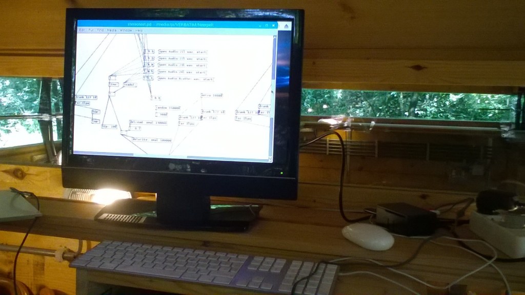 The generative composition is made of sounds recorded in the Klankenbos forest and transformed into abstract natural and musical sounds. The music is diffused into the space through the walls of the pavilion and the body of a large metal sculpture outside – with the help of audio transducers installed inside which turn the structures into large “invisible” speakers – which softly emit the sounds into the environment. The piece is self-organizing in nature and basically infinite, with the sonic events occurring and combining in random and probabilistic manner. It also has silent passages of variable lengths, allowing sounds from the environment to come into focus again and appear as part of the composition.